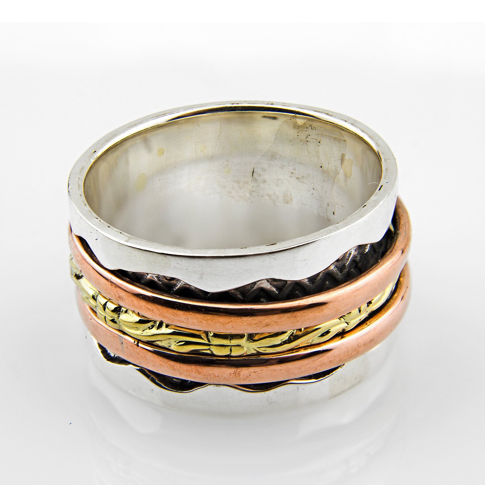 This silver rose gold band blends modern contrast with timeless simplicity in one elegant ring. Crafted from 925 sterling silver and weighing 9.78 grams, it features alternating sections of polished silver and warm rose gold tone. Each metal segment reflects light uniquely, creating a dynamic play of color and shine. Moreover, the band’s minimal profile and consistent width lend it a clean, modern silhouette. Consequently, this silver rose gold band suits both casual styling and refined evening looks, adding a subtle statement to any wrist.