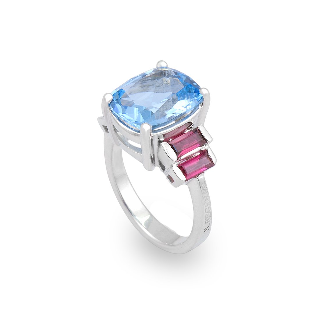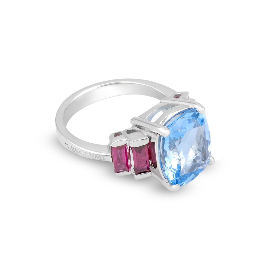 The Silver Spinel and Blue Topaz S.Begermi Ring captures a sense of refined brilliance and modern sophistication. Crafted in 925 sterling silver, the ring’s polished surface glows with a subtle sheen. At its heart rests a natural blue topaz that radiates clarity and serene light. Its tranquil hue contrasts beautifully with the silver’s cool tone, creating a striking harmony between stone and metal. Every detail reflects the timeless design language of Begermi by Antwerpen.