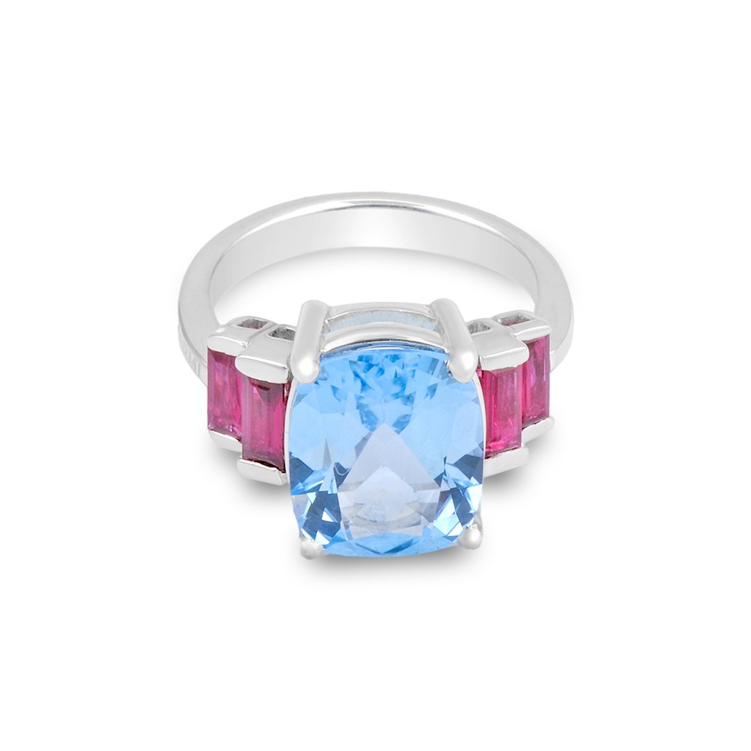 Encircling the centerpiece are four natural spinel stones, chosen for their elegant shimmer and depth. Their delicate brilliance complements the vibrant topaz, adding subtle contrast and visual balance. The intricate setting allows light to flow gracefully, enhancing each stone’s sparkle. Designed for effortless elegance, this ring unites fine craftsmanship and artistic precision, resulting in a piece that feels both luxurious and graceful.