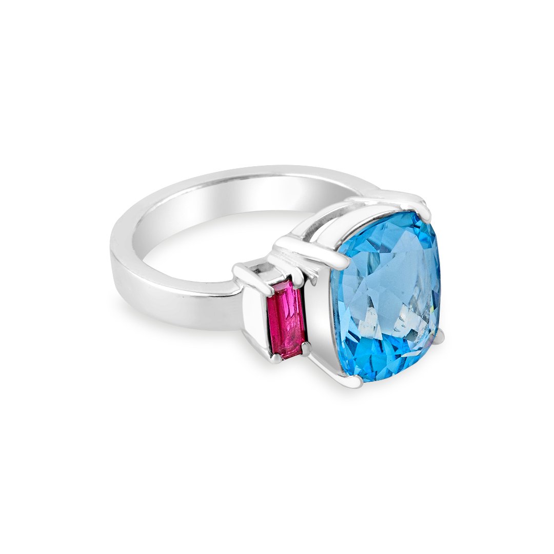 The Silver, Spinel and Blue Topaz S. Begermi Ring pairs bold color with refined structure. Crafted in 925 silver, it weighs 5.67 grams and fits comfortably. The design centers a vivid blue topaz that draws the eye. Meanwhile, two spinel accents add depth and contrast. Together they create a balanced, modern silhouette that flatters the hand.