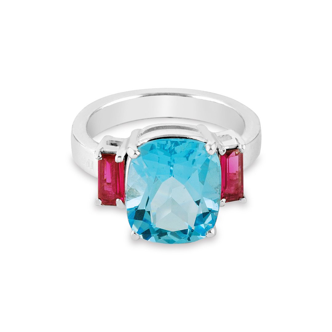 Two natural spinels sit beside the topaz to enhance color dialogue. Their darker tones frame the blue center and increase visual depth. Additionally, the setting positions each stone to maximize light and color play. Therefore, the composition remains harmonious even at close view. Furthermore, the band is shaped for stable, comfortable wear.