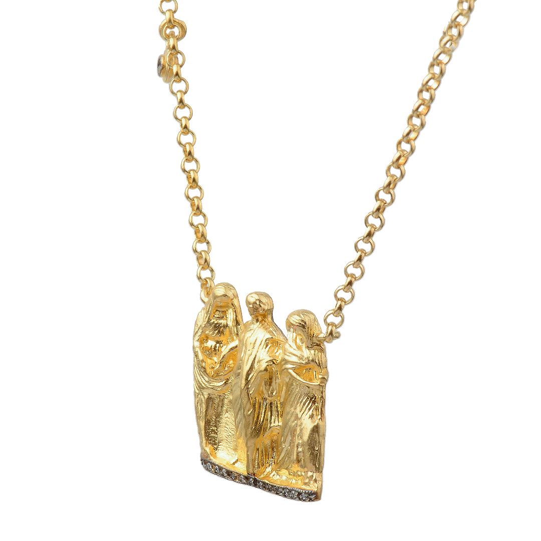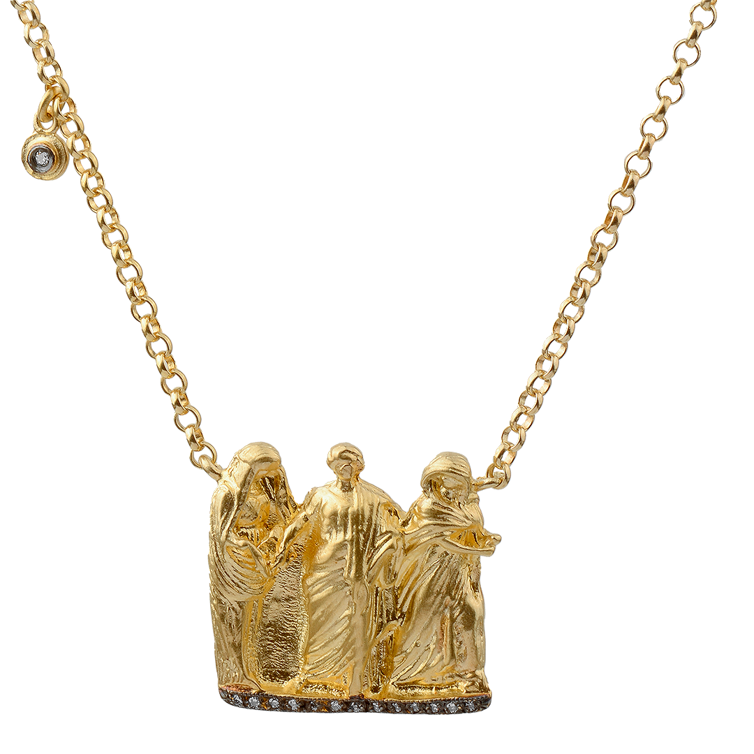 This necklace celebrates the bond of three people through elegant design. It is crafted in sterling silver fused with 1.02 g of 24 kt yellow gold. Smooth links form a flowing chain around the neckline. Moreover, precise metal fusion highlights every contour with gentle warmth. The motif traces three subtle peaks that echo shared journeys and lasting connection. This three people silver and gold diamond necklace blends symbolism with refined artistry. Furthermore, polished surfaces catch light in a warm, inviting glow. The design invites wearers to carry their story with quiet confidence and grace.