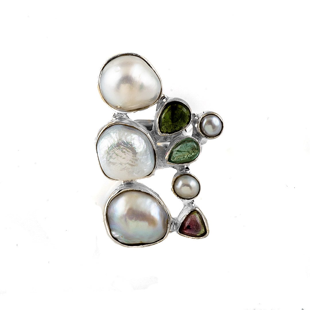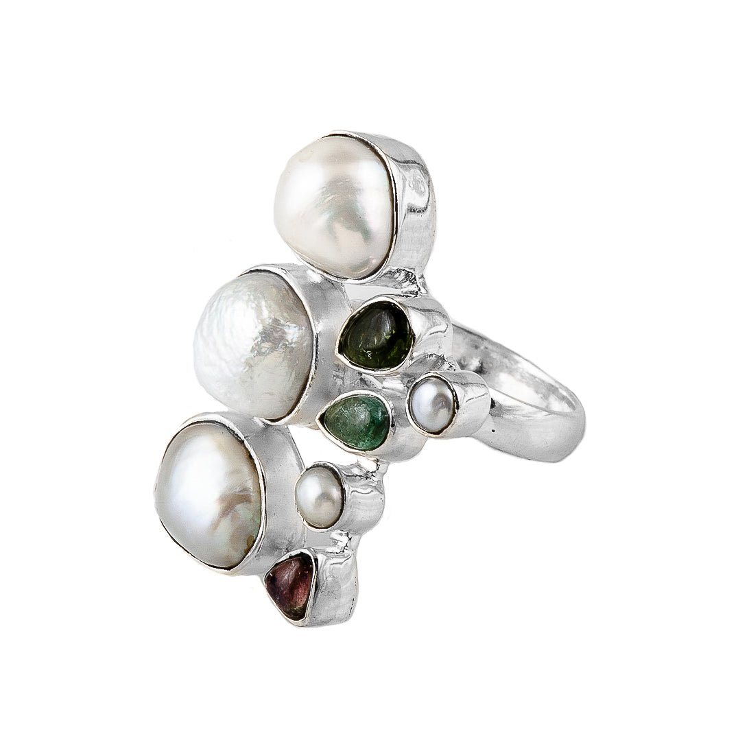 Tourmaline offers rich contrast against the pearly backdrop. It sits securely in a custom bezel setting. Meanwhile, the mother of pearl brings softness and depth to the composition. Furthermore, their pairing highlights both texture and hue in a dynamic interplay. The sterling silver finish delivers lasting shine and durability. Additionally, the ring resists tarnish, requiring minimal care to maintain its brilliance. Consequently, the gemstones remain radiant over time. Moreover, the design complements both casual and formal wardrobes.