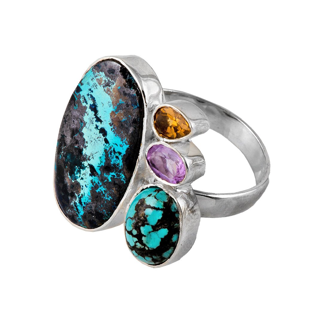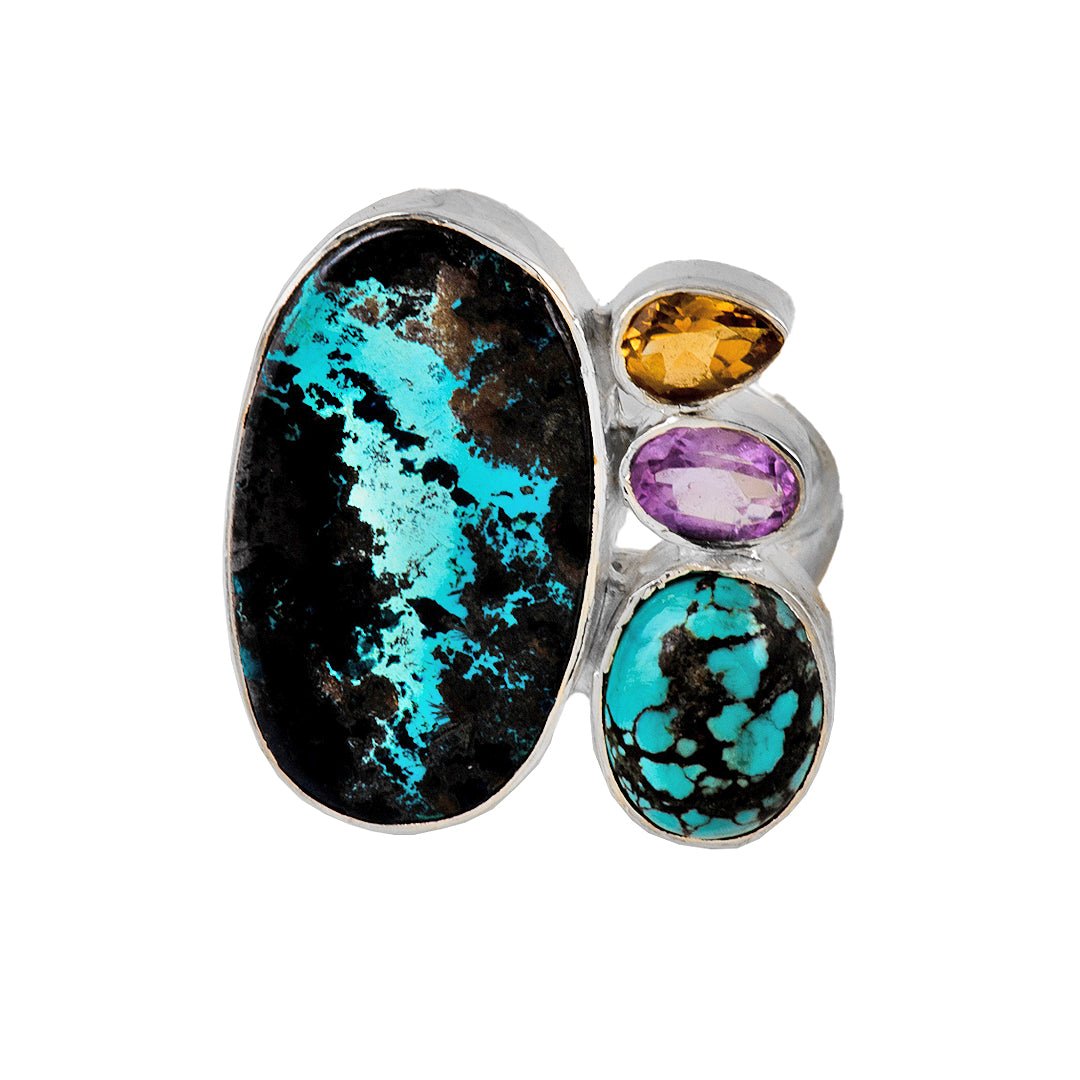 This turquoise citrine amethyst silver ring captures the essence of vibrant blooms in metal form. Crafted from 925 sterling silver, it weighs 9.52 grams for a balanced, comfortable fit. The design features a central turquoise stone flanked by warm citrine and accented with soft amethyst hues. Polished silver petals frame each gem with sculptural curves and precise detailing. Ultimately, this turquoise citrine amethyst silver ring blends natural harmony and colorful elegance for everyday wear.
