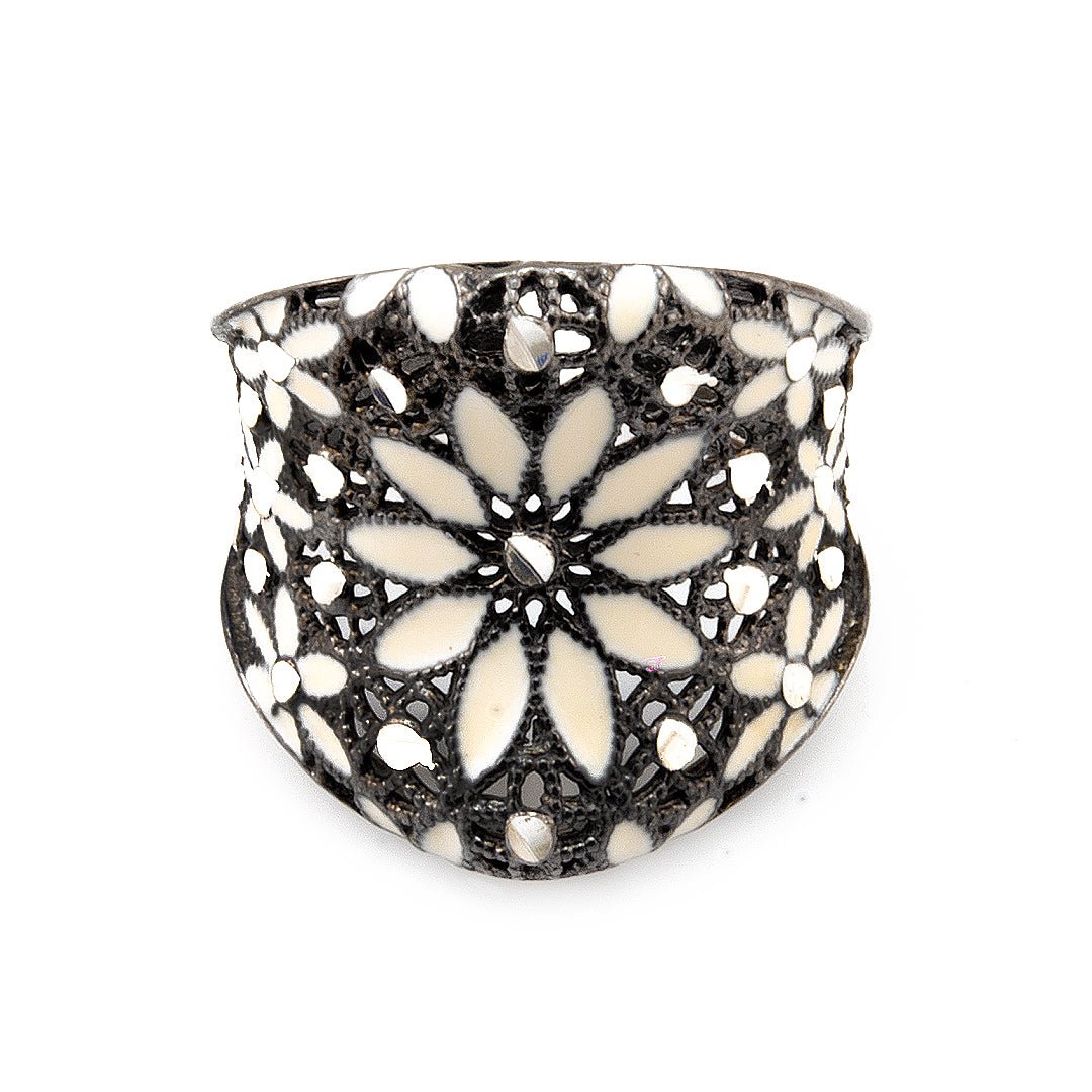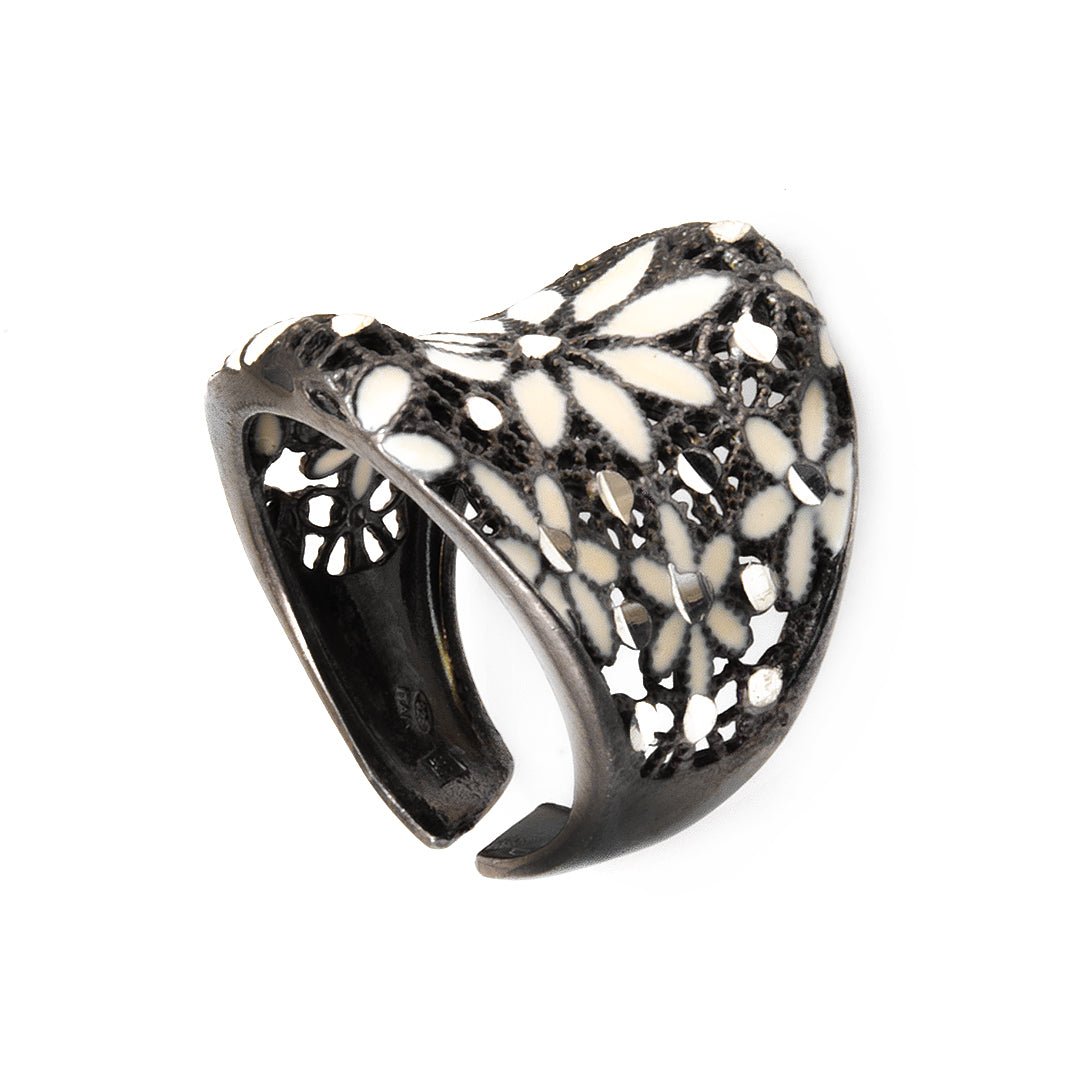 The flower form is sculpted with gentle curves that mirror the softness of real petals. Additionally, the white detailing enhances the organic shape, giving the piece an air of purity and calm. The open spaces between the petals add depth, while the silver base maintains a polished glow. This combination results in a design that feels fresh and grounded in nature. The white floral ring evokes both delicacy and strength through its artistic form.